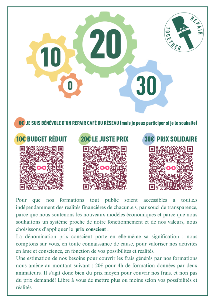 Repair Together organise des formations thématiques, gratuites pour les bénévoles du réseau. Elles fonctionnent sur inscription, avec un nombre minimum de participants pour assurer leur maintien. Nous demandons au public un prix en conscience pour valoriser le travail de notre association.