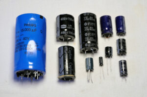 Condensateurs électrolytiques : cylindriques, ils sont souvent noirs ou bleus, avec une bande blanche ou dorée indiquant le pôle négatif. Ils ont deux pattes et une sorte de X creusé sur leur chapeau.