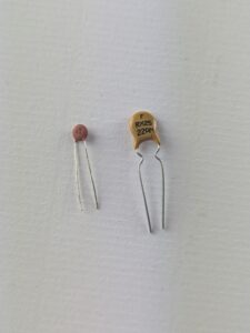 Condensateurs céramiques : de forme rectangulaire arrondie, ils sont souvent enrobés de plastique plus brillant. Ils tombent rarement en panne.