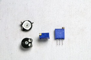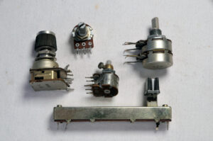 Ce sont de petits composants cylindriques ou rectangulaires, avec un axe rotatif (qu’on peut tourner avec un bouton). Ils ont généralement 3 pattes métalliques (entrée, sortie, curseur).