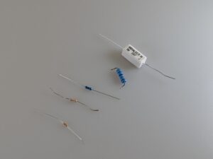 Les résistances classiques sont de petits cylindres allongés, souvent beiges ou bleus, avec des anneaux colorés indiquant leur valeur. Elles possèdent deux pattes métalliques fines.