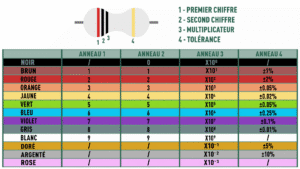 Pour lire la valeur d’une résistance, il existe un code des couleurs (bandes de couleurs).