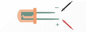 Une LED est une sorte de cylindre arrondi sur le dessus, parfois coloré. Neuve, elle a une patte plus courte que l’autre, qui indique sa borne négative.