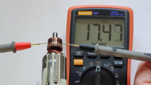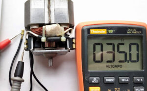 Rupture du fil d’une bobine : si l’une des bobines externes a un fil coupé, le moteur ne peut pas fonctionner. La fonction ohmmètre d’un multimètre est utilisée pour tester les bobines .