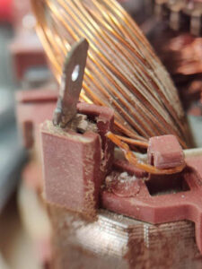 - Rupture d’une connexion : un autre point critique est la connexion des fils de cuivre des bobines avec les câbles transportant la tension vers le moteur. Ici aussi, on peut trouver des fils cassés à cause des vibrations grâce à une inspection visuelle. Il suffit de ressouder le fil à la connexion